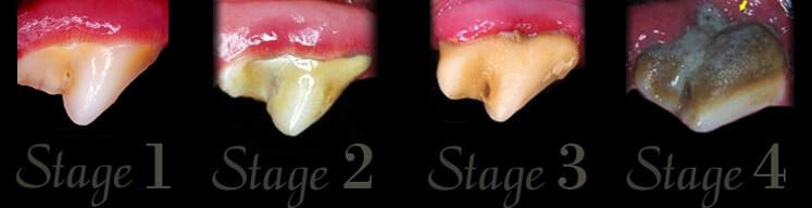 Grading dental disease is a way our Veterinarian’s can classify the severity of your pet’s dental disease. You’ll notice Stage 1 shows a relatively healthy tooth, with mild plaque build-up and slightly red gums. It’s at this stage that most owners don’t notice any external clinical signs. However, it is just a matter of time before it progresses and starts to become more obvious, like in Stage 3 or 4. These levels are at the high end of dental disease and is when the rest of the body also suffers, immune suppression, general un-wellness and lethargy is also very common by this stage.