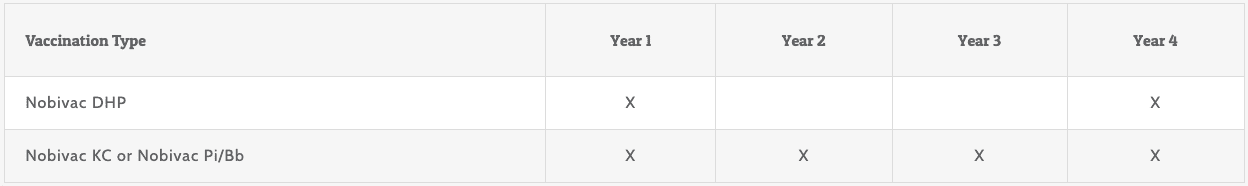 Currently at Morayfield Veterinary Clinic, we offer a yearly option, in the form of either an intranasal (Nobivac KC) or injectable (Nobivac Pi/Bb). See the Vaccination Schedule section below for more information.